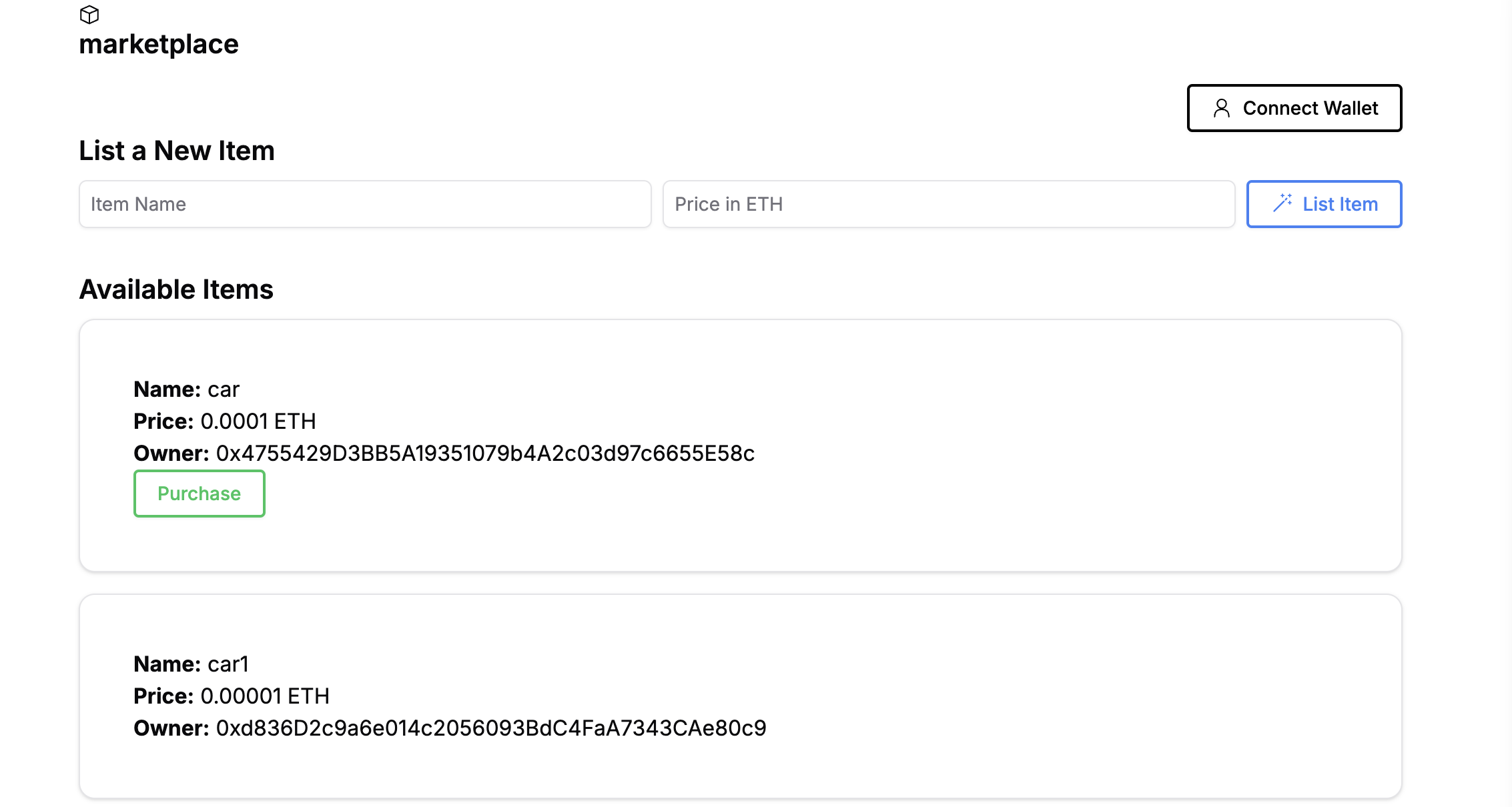 Now you have your simple decentralized marketplace dapp! You can explore further options and expand on this base with enhancements such as optimizing the user experience with additional features, or enabling bidding on items, auctions etc. The possibilities of dapps are endless.