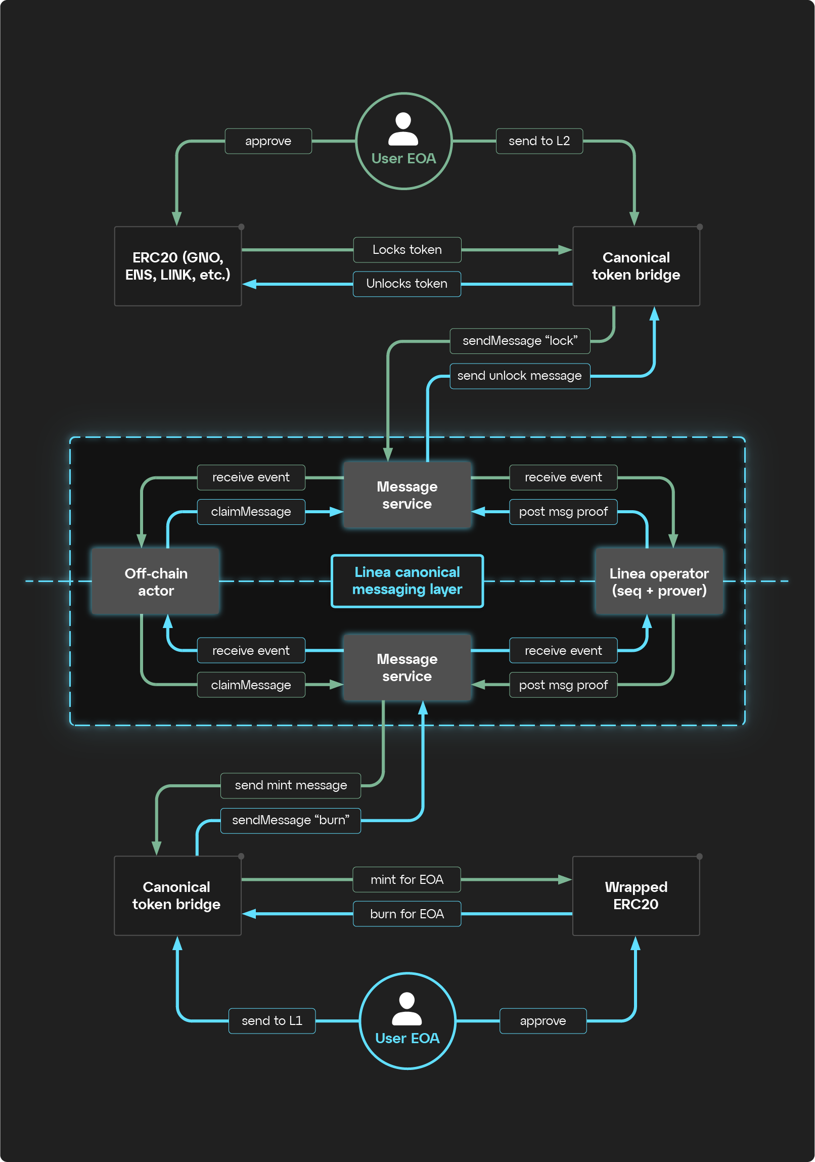 The canonical message service consists of three main elements: two smart contracts, and the postman service in between. As you may have guessed already, the smart contracts are on Linea and Ethereum, and are almost exactly the same. They allow for ETH to be minted on the target network, for example, though they are not limited to that.
